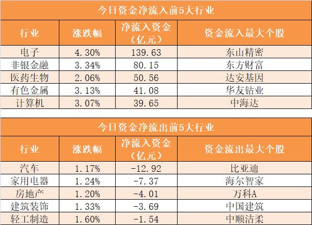 28个申万一级行业中,21个行业实现资金净流入,其中电子行业净流入139.63亿元居首。