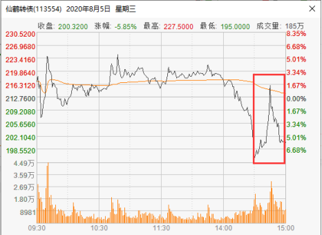 2020年8月5日,仙鹤股份股价走势出现了巨幅震荡,全天振幅16.74%,换手率51.81%,最终收盘微跌0.21%报收27.9元,多空交战激烈。当天,仙鹤转债的走势也出现了大幅震荡,最终以大跌5.85%报收200.32元。收盘时,仙鹤转债的折价率高达4.72%。