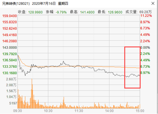 不过羊毛没薅不成,反被拔掉一撮毛的也是常有的事,兄弟转债就是这样的案例。2020年7月16日,兄弟科技以9.92%的跌幅开盘后迅速封死跌停,尽管中途有资金撬板,但最终还是以跌停收盘。当日,兄弟转债的市场预期明显要好于兄弟科技,开盘跌幅只有2.8%,在14点30分之后,兄弟转债出现了止跌企稳的迹象,最终收跌9.79%,所对应的转股折价率为4.21%。