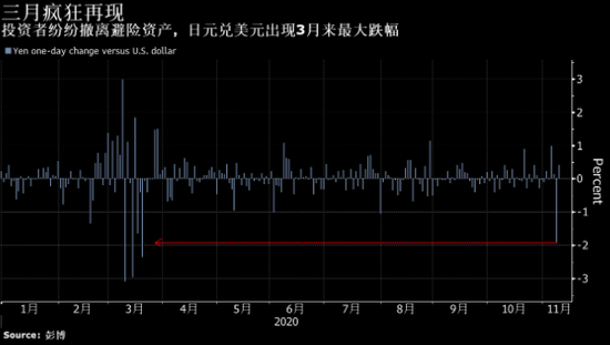 疫苗利好消息传出后,全球投资者纷纷从避险资产中撤走,日元周一创出3月以来最大跌幅。日元兑美元重挫近2%,跌破105关口。而受美国大选结果不确定性影响,上周五日元还曾逼近过103。