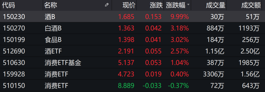 白酒板块今日表现较为活跃,申万食品饮料行业指数涨幅为0.59%,在申万一级行业中排名第三位,金徽酒(603919.SH)尾盘涨停,今世缘(603369.SH)一度涨停。场内相关主题基金方面,酒B(150230.SZ)强势涨停,白酒B(150270.SZ)涨幅超过3%。