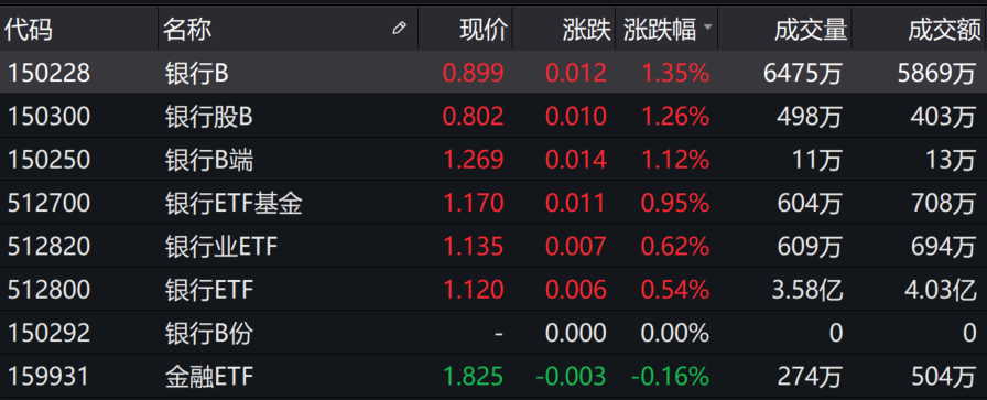 除此之外,银行板块同样表现强势,申万银行行业指数以0.74%的涨幅位居申万一级行业榜首。场内相关主题基金涨跌互现,其中,银行B(150228.SZ)、银行股B(150300.SZ)、银行B端(150250.SZ)涨幅超过1%。
