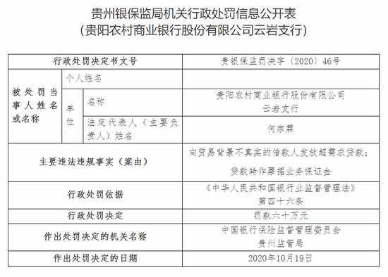 具体来看,贵阳农村商业银行因涉及批量转让不良债权资产包的首付款比例不符合规定、投资非标债权超规模限制、通过同业投资承接本行不良资产三项违法违规行为,被处罚款120万;贵阳农村商业银行白云支行因贷前调查审查严重不尽职,借款人商用房按揭贷款首付款交易凭证虚假、以贷还贷,掩盖不良资产,贷款分类不准确,被处罚款60万;贵阳农村商业银行花溪支行因银行承兑汇票贴现资金回流至出票人,被处罚款50万;贵阳农村商业银行南明支行因贷款三查严重不尽职、借款人部分首付款来源于房开企业、流动资金贷款用于项目建设和置换他行项目建设贷款,以贷还贷,被处罚款90万;贵阳农村商业银行小河支行因贷前调查审查严重不尽职、违规发放流动资金贷款用于支付土地征收款、中长期贷款展期期限超过原期限的一半、违规向房地产企业融资,被处罚款100万;贵阳农村商业银行云岩支行因向贸易背景不真实的借款人发放超需求贷款、贷款转作票据业务保证金,被处罚款60万。