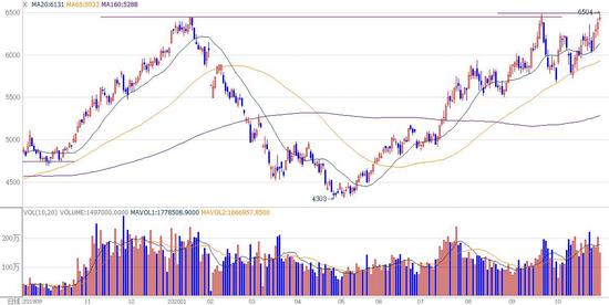 上图是棕榈油指数日线图,2020年1月高点6445,4月27日见底4303,9月27日创新高6490后快速回落,未能有效突破前期高点,5个月内上涨了51%,6490一带是重要阻力位。9月30日后的上涨,呈3浪结构,回调很深,成交持续放大,表明市场分歧加大,短期内有效向上突破可能不大。