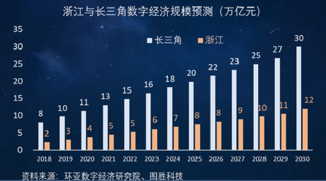 作为数字经济的全球创新高地,长三角与浙江的数字经济以及数据量的产生走到了全球前列。环亚预测,到2030年,长三角与浙江的数字经济规模将分别达到30万亿及12万亿元。