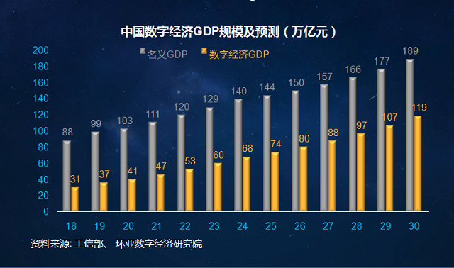 中国与全球加速迈进数字经济时代,据环亚数字经济研究院预计,到2030年中国数字经济规模为120万亿元,同时,中国数字经济在全球占比将达35%。