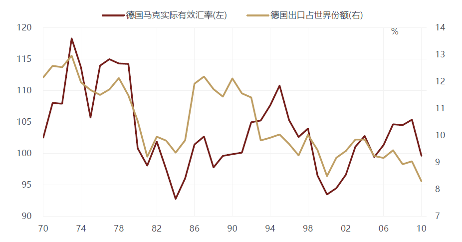 比如德国、日本(图3和图4),在全球出口的竞争力很大程度上决定了它本币的长期汇率走势。