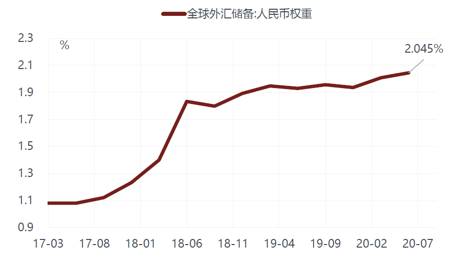 当然,中国目前在外汇储备中的占比还是非常低的,只有2%,跟中国在整个全球经济的占比来比是微不足道的。