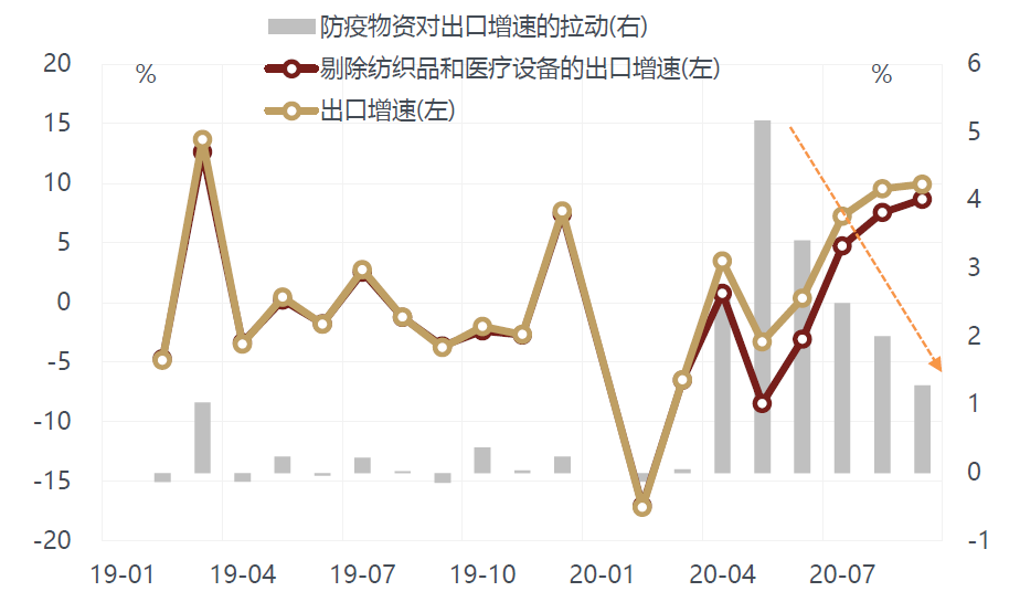 出口超预期部分是跟疫情相关的,尤其是在欧美上半年疫情爆发最严重的时候,中国的出口结构当中有相当一部分是靠防疫物资带动的。