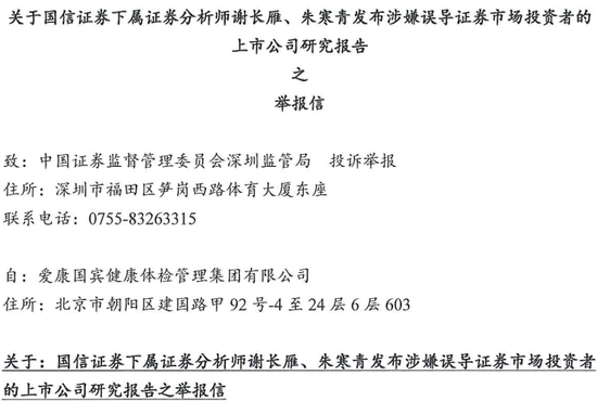 基于上述,爱康国宾特向贵会提出上述实名举报、投诉,请求贵会对国信证券分析师谢长雁、朱寒青开展调查,如查明存在相关违法、违规事实的,亦恳请依法对其进行惩戒以及自律处罚并将相关情况告知我司。我司联系人信息如下: