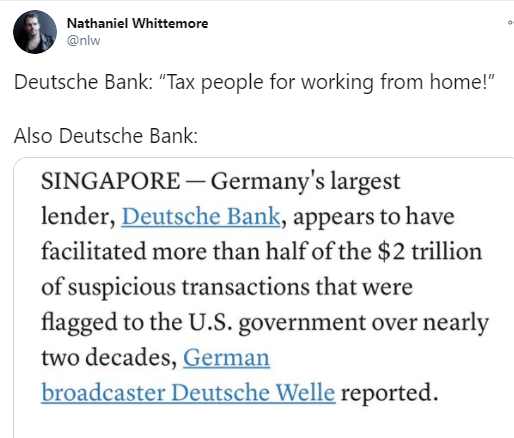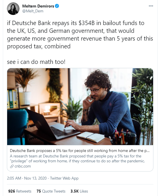 截图来自美国CNBC新闻网的报道可德意志银行为什么会认为这些居家办公的人是“特权”群体,并打算向他们额外征税呢?