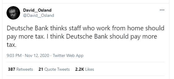 据多家西方媒体报道,德国的德意志银行近日提出了一项极具争议的税收建议:对居家办公的人征收5%的“特权税”。