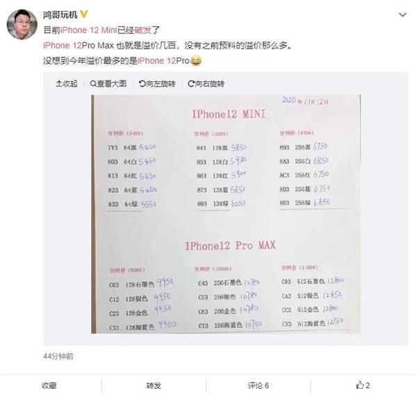 数码博主 @鸿哥玩机放出了线下渠道的现货报价,iPhone 12 mini 已经破发,iPhone 12 Pro Max 需要加价。如下图所示,iPhone 12 mini 64GB 黑色和蓝色最低,为 5400 元,128GB 最低为 5850 元;iPhone 12 Pro Max 128GB 最低加价600。
