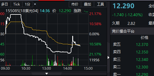 从紫光集团债券盘面来看,“18紫光04”上演了“过山车”行情。“18紫光04”早盘曾涨超20%,随后于10:15左右开始下跌,午后一度跌20%左右,截至发稿,“18紫光04”跌12.4%,报12.29元,较面值折价 87.71% 。