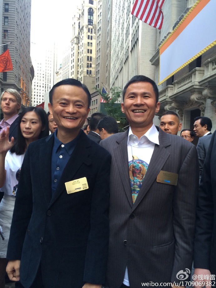 图片来源:钱峰雷微博 阿里巴巴上市时钱峰雷与马云合照