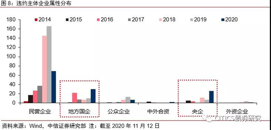 截至11月12日,2020年违约信用债规模合计1554亿元,违约只数累计136只。其中国企、央企违约数量合计达56只,占2020年所有违约债券种类的41.18%。