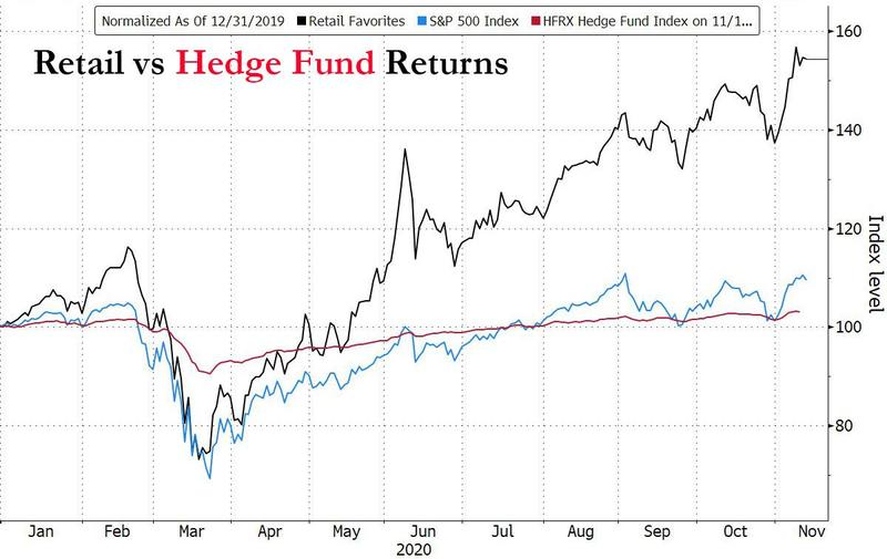 Zerohedge的另一组数据则显示,今年以来,美国散户已经赚了55%。这意味着,美国散户的收益和对冲基金的收益比居然达到了10:1。