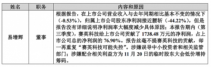 上述的异议声明,正是来自于易增辉,该人士表示:根据报告,在上市公司营业收入与去年同期相比基本不变的情况下(-0.53%),归属上市公司股东净利润接近腰斩(-44.22%),但是报告没有详细说明净利润率大幅度减少具体原因;本报告期内(第三季度),赛英科技给上市公司贡献了1738.48万元的净利润,占上市公司总的净利润的76.9%。报告丝毫不提赛英科技的贡献,却一再重复“赛英科技可能失控”。涉嫌误导中小投资者和相关监管部门;涉嫌配合相关利益方为11月20日的临时股东大会低价增持筹码。
