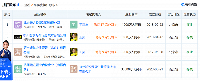 天眼查记录,王晟持有北京曦之投资管理有限公司99.9%的股份,99.99%的杭州智享好车信息技术有限公司,另外手握第一好车企业管理(北京)有限公司5%的股份,预计杭州曦之置业合伙企业(有限合伙)88.39%的股份。