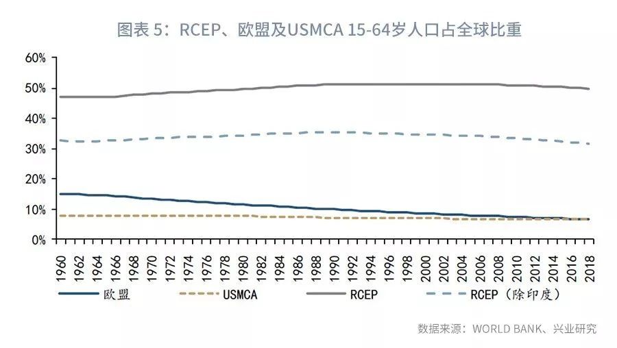 此外,从人口规模看,截至2018年除印度外的RCEP人口占全球比重为29.7%,分别超出欧盟及美加墨23.0及23.2个百分点,参见图表4。从年龄结构看,RCEP拥有世界最年轻人口的人口结构,截至2018年除印度外的RCEP区域拥有全球31.6%的15~64岁人口结构,分别高出欧盟及美加墨区域24.9及18.4个百分点,参见图表5。