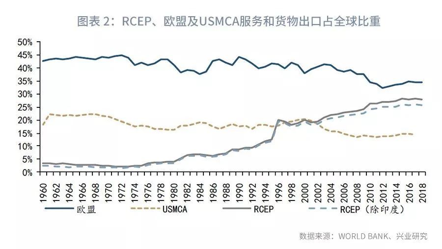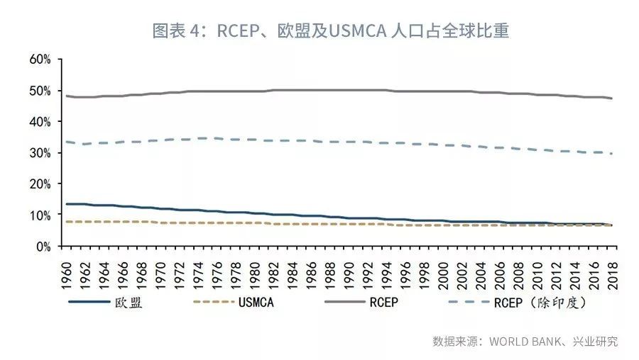 RCEP的签订意味着全球最大自贸区成立。与美加墨自由贸易区和欧盟自由贸易区相比,RCEP无论是在经济总量及人口总量,均为世界之最。