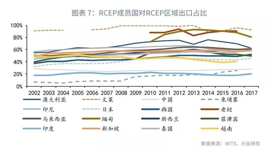 其次,从各成员国对RCEP区域出口占比趋势变化看,除文莱、老挝、缅甸、澳大利亚、泰国外,2015年以来其他成员国对RCEP区域出口依赖度均为上升趋势,参见图表7。由此折射出未来贸易创造效应及贸易转移效应有较好基础。