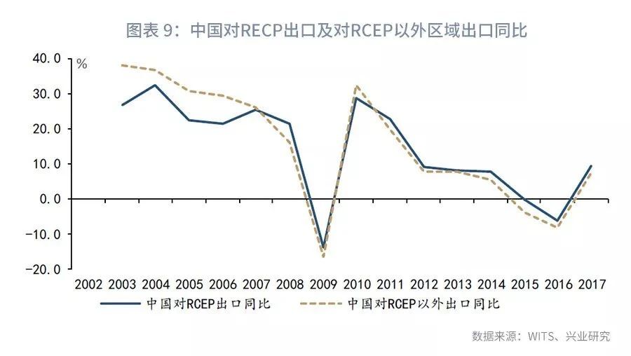 数据显示,2010年中国东盟自贸区正式建立以后,中国对RCEP区域出口增速显著高于对RCEP以外区域的出口增速,参见图表9。这或表明中国东盟自贸区建立将进一步促进中国对东盟地区的出口,那么RCEP的签订对于中国出口影响又有多大?
