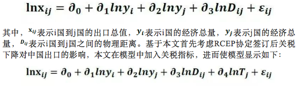 在国际贸易领域中,引力模型通常被用来分析双边贸易量,其基本思想为两国之间的双边贸易量取决于双方的经济规模以及二者的物理距离。模型的基本公式如下: