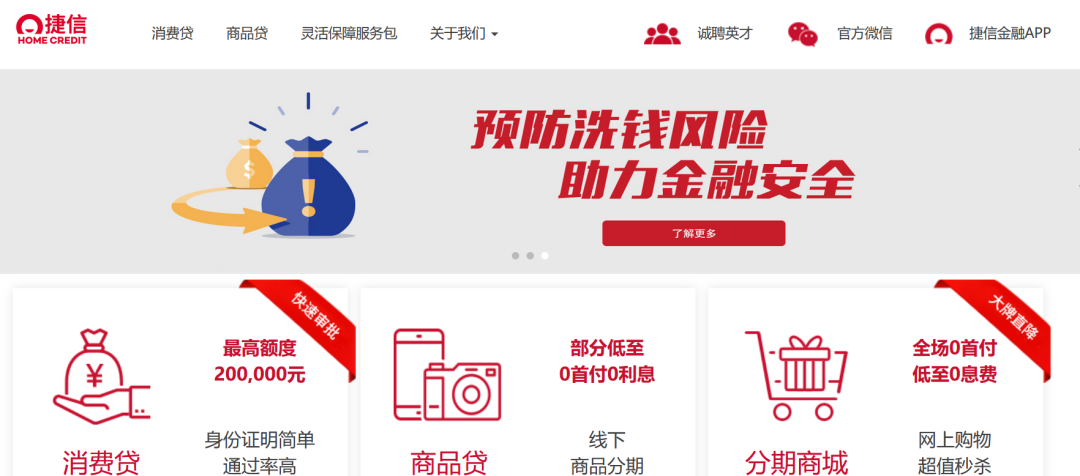 由于产品定位的差异,通常消费金融贷款的利率高于普通的银行个人贷款,年利率通常达到12%-36%。但消费金融公司通常在官网只展示最低利率或最低还款额,几家头部消费金融公司也不例外。