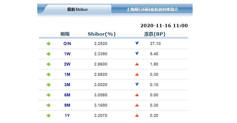截至11点左右,Shibor短端品种涨跌互现。隔夜品种下行27.1bp报2.252%,7天期下行9.4bp报2.339%,14天期上行1.8bp报2.86%,1个月期上行0.3bp报2.682%。