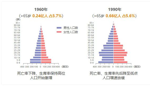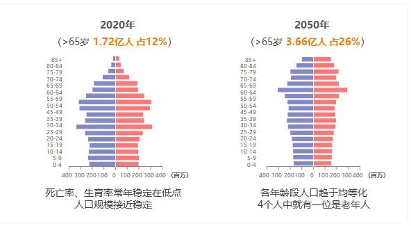 低死亡率和低出生率两个因素带来寿命延长和人口结构的缓慢变化,推动人类社会向老龄化阶段迈进,给经济社会带来巨大的影响。所以老龄化描述的是老年人口占比增加后的一种人口现象,关注老年人口变化的阶段性过程和发展困境,其视角着眼于老龄人口本身及其产生的问题,偏向被动应对。