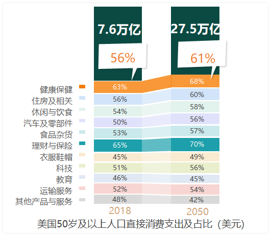 当全球步入长寿时代,需要创造以老龄人口为核心的第三次人口红利,推动长寿经济发展。一方面,针对老年人不断变化的需求推动大量新产品和服务并为其提供资金,以直接、间接或者引导的方式形成和改变市场,缔造全新的长寿经济。波士顿咨询集团预计,到2030年美国55岁以上的人口消费将占美国自2008年以来消费支出增长的50%,日本和德国的这一数字分别是67%和86%。