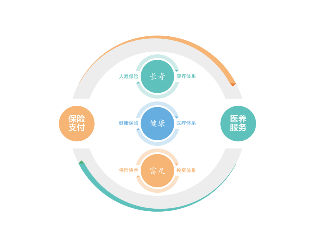 其次,企业作为市场配置资源的主体,可以通过商业模式和组织体系的创新,来提升资源配置的效率,甚至创造新需求增加社会总体财富。保险企业可以纵向整合老年生命产业链,将虚拟保险和实体医养相结合,打造“活力养老、高端医疗、卓越理财、终极关怀”四位一体的创新商业模式,构建服务全生命周期的大健康产业生态体系,为解决长寿时代的挑战提供相关方案。