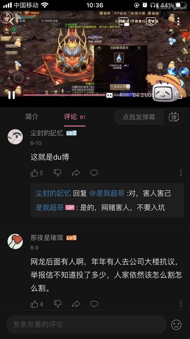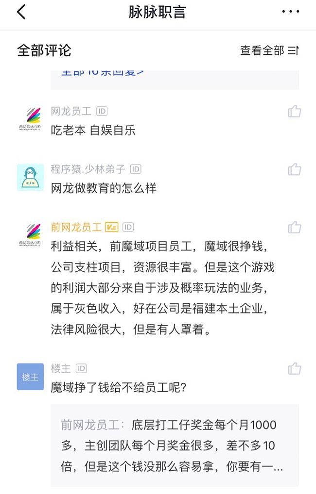 一位游戏行业人士表示,犯罪嫌疑人或为网龙旗下魔域游戏玩家,近年来,魔域因涉嫌赌博问题备受争议。在某职场社交平台上,一位自称是网龙公司魔域项目前员工的人士称,魔域游戏的利润,大部分来自于涉及概率玩法的业务,属于涉赌擦边球的灰色收入。