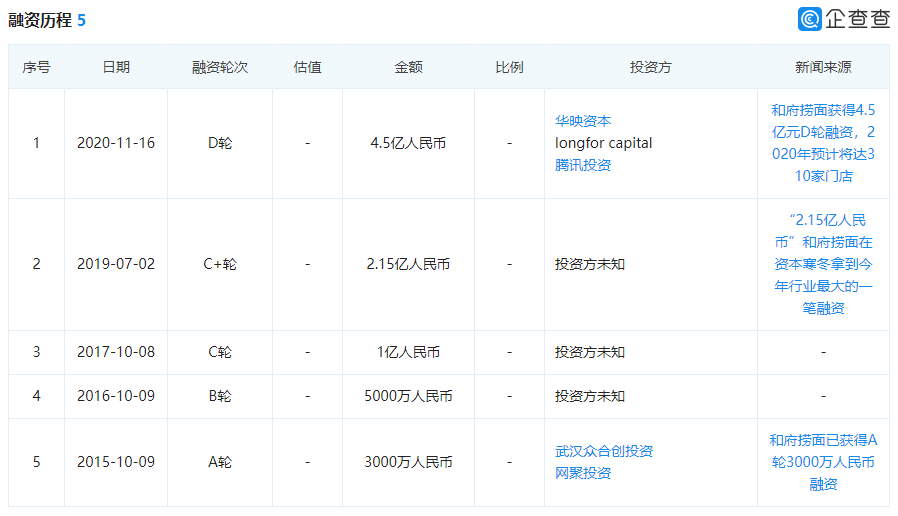 而上一次和府捞面获得资本融资还是一年多以前。2019年7月,和府捞面宣布获得C+轮2.15亿元融资;而在2015年、2016年、2017年,和府捞面连续三年分别拿下3000万元人民币、5000万元人民币和1亿元人民币的A轮、B轮及C轮融资。