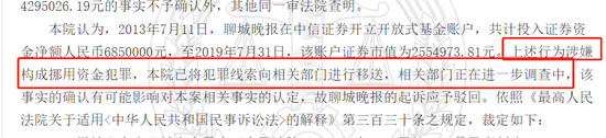 二审法院认为,2013年7月11日,聊城晚报在中信证券开立开放式基金账户,共计投入证券资金净额685万元,至2019年7月31日,该账户证券市值为255.5万元。上述行为涉嫌构成挪用资金犯罪,本院已将犯罪线索向相关部门进行移送,相关部门正在进一步调查中,该事实的确认有可能影响对本案相关事实的认定,故聊城晚报的起诉应予驳回。(法说资本 恢恢)