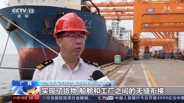 钦州港海关综合业务科科长 刘济宁:率先在广西推行集装箱货物船边直提、抵港直装模式,实现了货物船舱和工厂之间的无缝衔接,拓展完善广西国际贸易单一窗口功能。