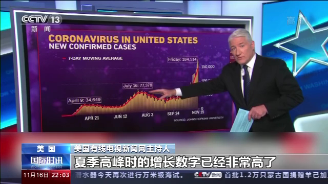 美国有线电视新闻网主持人:疫情曲线非常惊人,夏季高峰时的增长数字已经非常高了,单日新增病例最高达到7.7万例左右,而上周五的单日新增攀升到了18万例。