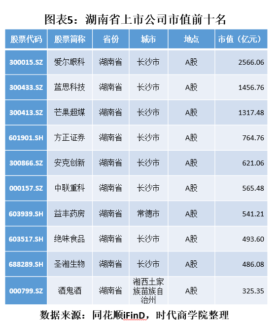 整体来看,湖南省的上市公司集中在长沙、岳阳、株洲一带,经济实力偏弱的城市较难诞生上市公司,所诞生的上市公司多以当地的自然资源为依托,如张家界市的旅游资源上市公司——张家界(000430.SZ),湘西土家族苗族自治州的酒鬼酒,怀化市的大康农业(002505.SZ),反映出这些的城市的营商环境尚不成熟。