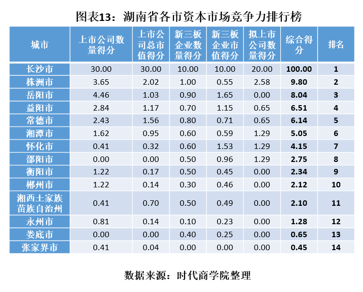 时代商学院统计了湖南省各大城市在A股、新三板、港股、美股上市(挂牌)公司的数量以及总市值,以此为基础来衡量城市的资本市场竞争力,结果如图表13所示。