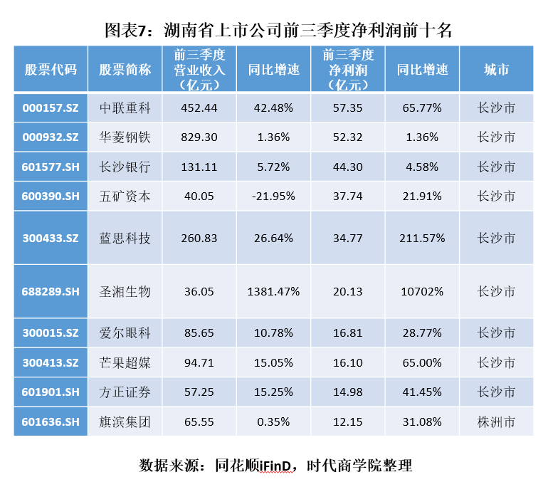 2020年前三季度,湖南省的A股上市公司合计实现营业收入5025.38亿元,同比增长24.26%,实现净利润404亿元,同比增长37.52%,业绩增长迅猛。在上半年受疫情打击下仍能取得如此成绩,实属难能可贵,也反映了湖南省经济增长势头迅猛。