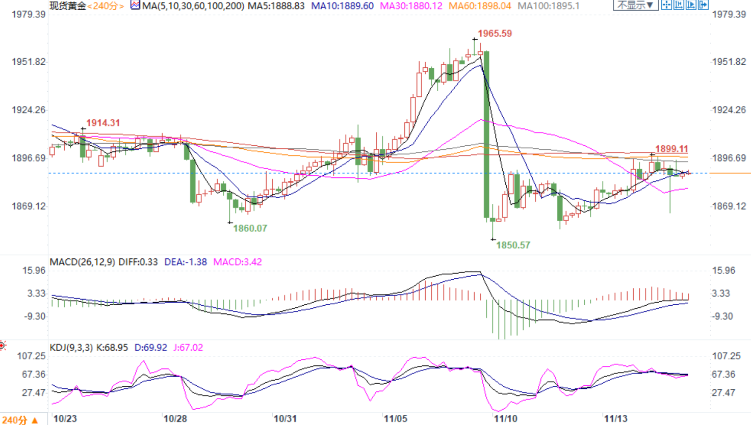 震荡上行;MACD金叉,KDJ金叉尚未形成,上行势头偏弱,短线震荡格局,新建空单可背靠1900大关,预计将在1860-1900区间交易,多空头思维需转为区间交易。