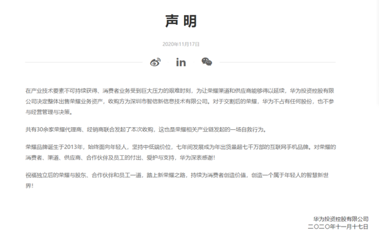 今日(17日),多家企业在《深圳特区报》发布联合声明,深圳市智信新信息技术有限公司已与华为投资控股有限公司签署了收购协议,完成对荣耀品牌相关业务资产的全面收购。出售后,华为不再持有新荣耀公司的任何股份。