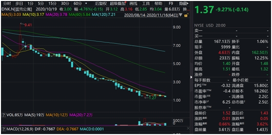 2020年1月17日,蛋壳公寓(DNK.N)在纽交所敲钟,共发行960万股美国存托股票(ADS),每股ADS相当于10股A类普通股,发行价为每股ADS 13.5美元。不过,蛋壳公寓上市首日即破发。今年以来股价一路下滑,截至最新收盘,蛋壳公寓每股ADS已跌去九成,仅剩1.37美元,总市值为2.5亿美元。
