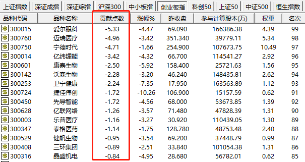 爱尔眼科、宁德时代、亿纬锂能、康泰生物等权重股表现弱势,也是拖累创业板指的原因。