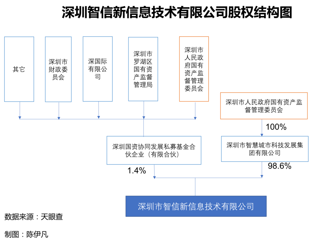 综合目前的收购方案及天眼查显示的股权结构,荣耀的收购方深圳智信新的两大股东分别是深圳市智慧城市科技发展集团有限公司(占股98.4%)和深圳国资协同发展私募基金合伙企业(占股1.4%),其中深圳市智慧城市科技发展集团有限公司由深圳市国资委全资持有(参见下图)。