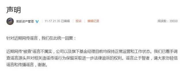 针对这则“被查”传闻,高毅资产迅速回应。17日晚,据“高毅资产管理”微博消息称,近期网传“被查”谣言不属实,公司以及旗下基金经理目前均保持正常运营和工作状态。我们已着手调查谣言源头并对相关造谣传谣行为保留采取进一步法律追诉的权利。谣言止于智者,请大家勿轻信谣言和传播谣言。