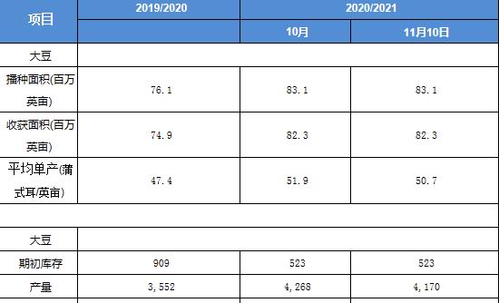 从USDA11月报告来看,美新豆播种面积8310万英亩(上月8310万英亩、上年7610万英亩),收割面积8230万英亩(上月8230万英亩、上年7500万英亩),单产50.7蒲(预期51.7蒲、上月51.9蒲、上年47.4蒲),产量41.70亿蒲(预期42.53亿蒲、上月42.68亿蒲、上年35.52亿蒲),出口22.00亿蒲(上月22.00亿蒲、上年16.76亿蒲),压榨21.80亿蒲(上月21.80亿蒲、上年21.65亿蒲),期末库存1.90亿蒲(预期2.39亿蒲,上月2.90亿蒲、上年5.75亿蒲)。报告虽然保持了美豆的播种面积以及收割面积不变,但明显下调了单产,从而导致产量也出现明显下调,在出口以及压榨率保持不变的背景下,期末库存大幅回落,给市场以美豆消化库存,且库存偏紧的状态,总体提振美豆走势。