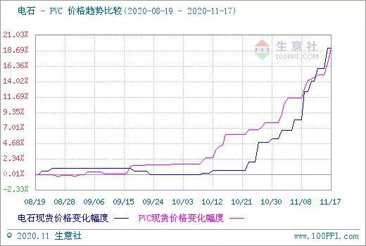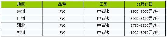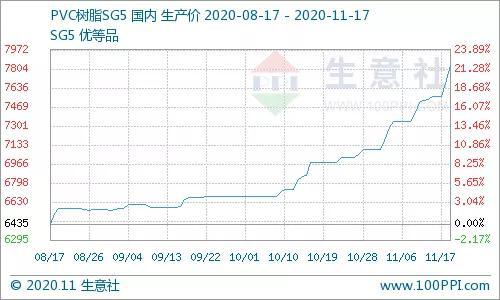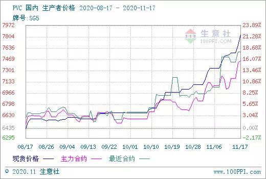 根据生意社监测的数据显示(电石法SG5出厂均价),11月17日国内PVC主流均价7832.5元/吨,较前一日上涨2.05%,较月初上涨10.43%,环比上涨12.29%,与去年同期相比上涨16.17%。