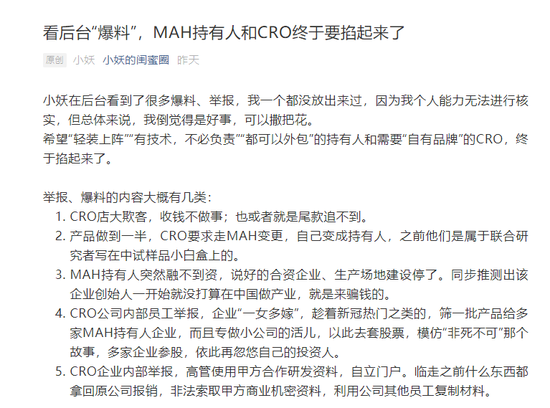 今天一篇题为《看后台“爆料”,MAH持有人和CRO终于要掐起来了》的文章在业内流传。该文来自公从号“小妖的闺蜜圈”。